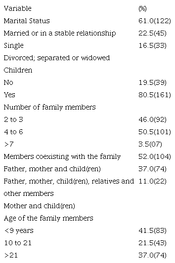 Regarding marital status, 61.0% participants were married or living in a stable relationship. The presence of children in the households was 80.0% and the predominant number of members in the families was four to six in more than half of the sample. When asked about the members coexisting with the family, there was a predominance of father, mother and children in 52.0% families and the age of the family members was mostly under 9 years old with 41.5% (Table 2).