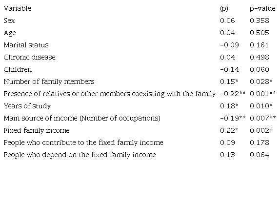 There were negative correlations between the effectiveness of family functioning and the main source of income (-0.191 and p=0.007), which means that the greater concentration of families with employment, as the main source of income, resulted in lower effectiveness of family functioning. There was a negative correlation between the effectiveness of family functioning and the presence of relatives or other members coexisting with the family (-0.229 and p= 0.001), that is, the greater the presence of other members or relatives such as mother-in-law, grandson, son-in-law, brother-in-law, nephew, uncles, cousins, the lower the effectiveness of family functioning of these families.