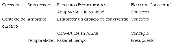 Como se muestra en el Cuadro 1, la adaptación a la realidad es un elemento estructurante de la categoría contexto de cuidado, entendida como una estrategia del ser-en-el-mundo de la ERC para continuar existiendo, inherente a la condición en que se encuentra el ser-paciente y el ser-enfermero pasando a relacionarse en un ambiente que es dinámico.