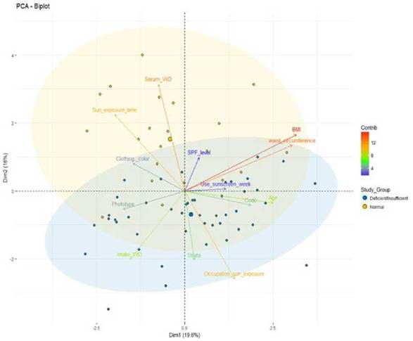 The dots show the separation between the two groups studied according to the socio-economic variables and other factors related to vitamin D: deficient/insufficient (blue) and normal (yellow). The color scale of each arrow and the name of each variable represent how much does each variable contribute to the main component, red being the one that contributes the most and blue being the one contributing less (see color scale to the right).