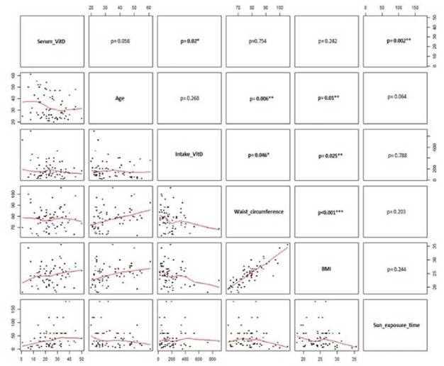 To establish the correlation between vitamin D serum levels with different variables such as age, vitamin D intake, waist circumference, BMI, and time of sunlight exposure, we used Spearman's test. A significant positive correlation between vitamin D serum levels and time of sunlight exposure (p= 0.002); age and CW (p= 0.006); age and BMI (p= 0.01); and CW and BMI (p= 0.001) were observed (Figure 2).