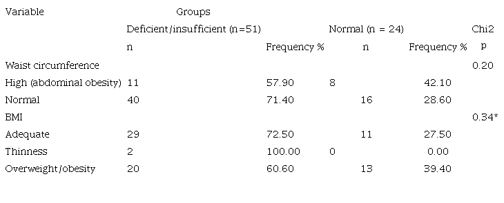 According to anthropometric measurements, 60.60% n (20) of overweight/obesity participants and 57.90% n (11) of high CW (abdominal obesity), presented deficiency/insufficiency vitamin D. Despite the fact that hypovitaminosis D was more frequent in individuals with excess weight and abdominal obesity, there were no statistically significant differences between the nutritional state and vitamin D serum level classification when Chi-square test was used (Table 2).