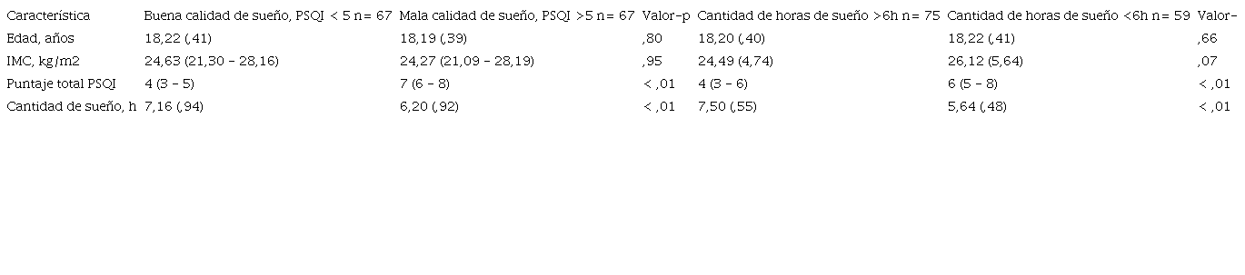 Las Tablas 1 y 2 muestran las características sociodemográficas y de salud por grupos de calidad y cantidad de sueño. En comparación con el grupo con una buena calidad de sueño, en el grupo con una mala calidad de sueño, quienes obtuvieron una mediana del puntaje en el PSQI de 7 puntos (Q1 - Q3= 6 - 8 puntos), se observó una mayor cantidad de participantes dedicados exclusivamente al estudio (p= .04), así como un menor promedio de la cantidad de horas de sueño por noche (p < ,01). En el grupo con una duración de sueño < 6 horas (5,64 horas, DE= ,48 horas), se observó una tendencia en el promedio del IMC (p= ,07) y una mediana superior del puntaje total del PSQI (p < ,01) en comparación con aquellos que reportaron dormir la cantidad de horas recomendada. En general, no se observaron otras diferencias en las variables restantes entre los grupos.