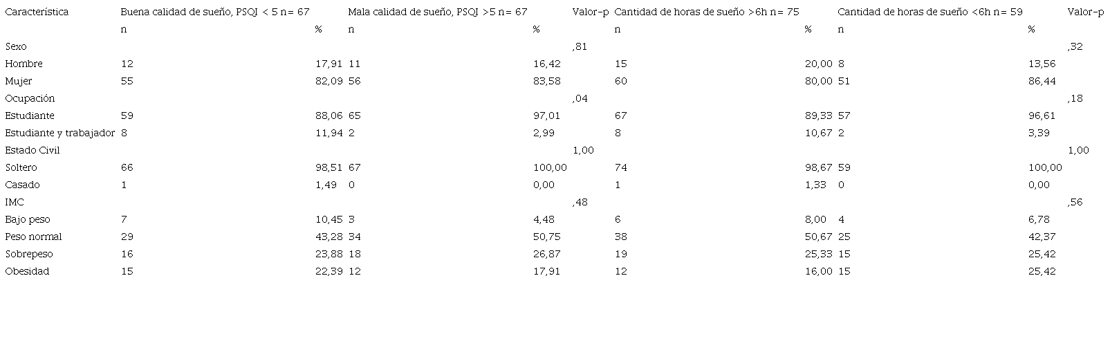 Materiales y métodos: Estudio transversal en estudiantes de nuevo ingreso de Enfermería en una Universidad Pública de México. Muestreo por conveniencia de n=134 estudiantes (18-19 años), voluntarios y matriculados en la facultad. La calidad y cantidad de sueño se midió con el Índice de Calidad de Sueño de Pittsburgh. El IMC se calculó con la fórmula estándar. El protocolo fue aprobado por el Comité de Ética de la facultad, los participantes firmaron el Consentimiento Informado.