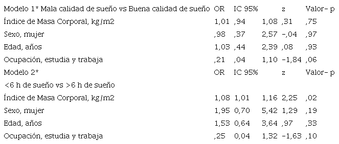 Los resultados de los modelos de regresión logística ajustados por edad, sexo y ocupación se muestran en la Tabla 3. No se observó una asociación entre la calidad del sueño y el IMC (modelo 1, OR= 1,01; IC 95%= ,94 - 1,08; z= ,31; p= ,75). Sin embargo, el incremento en el IMC se asoció con una mayor probabilidad de dormir 6 horas o menos (modelo 2, OR= 1,08; IC 95%= 1,01 - 1,16; z= 2,25; p= ,02).