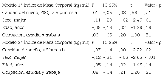 Asimismo, se exploraron por separado dos modelos de regresión lineal tomando en cuenta como variable desenlace el IMC y como exposición, para el modelo 1, la calidad de sueño (PSQI> 5 puntos y PSQI< 5 puntos) y la cantidad de horas de sueño por noche (> 6 horas y < 6 horas) para el modelo 2. Ambos modelos fueron ajustados por las variables de confusión anteriormente mencionadas (edad, sexo y ocupación). Se utilizó la transformación logarítmica del IMC porque se rechazó la hipótesis nula de normalidad (prueba sesgo- curtosis D'Agostino, p< ,05). Los modelos de regresión lineal ajustados cumplieron los supuestos de normalidad, linealidad y homocedasticidad (p> ,05).