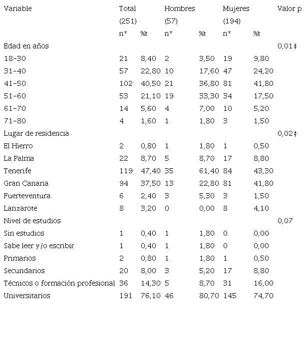 En el total de participantes, la media de edad fue de 45,09 años ±10,38, el 56,90% (143) era residente de Santa Cruz de Tenerife y el 43,10% (108) era residente de Las Palmas. Entretanto, el promedio de edad para los hombres (n=57) fue de 47,70 años ±10,07, para las mujeres (n=194) fue de 44,32 años ±10,37. El 71,90% (41) de los hombres y el 72,70% (141) de las mujeres, se identificaron como trabajadores independientes. La mayoría refirió no padecer ninguna enfermedad física, 89,50% de los hombres (51) y 85,60% de las mujeres (166); tampoco enfermedad mental, 96,50% (55) y 97,40% (189) correspondientemente. Otras características sociodemográficas se pueden consultar en la Tabla 1.