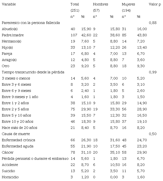 Características relacionadas con la pérdida. Se consultó parentesco con la persona fallecida, edad de la persona fallecida, tiempo desde que sucedió la muerte, causa de muerte, si la muerte fue prevista o imprevista, si era el cuidador principal de la persona fallecida, si existían conflictos por resolver, si recibió ayuda para manejar la pérdida y el nivel de comunicación habitual con los demás.
