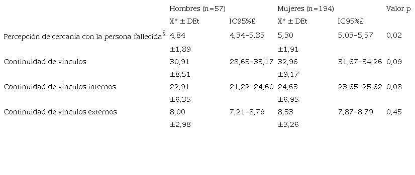 Resultados: Edad media de 45,09 años ±10,38. Un 22,70% (57) fue hombre, 77,30% (194) mujer. Se identificaron diferencias significativas entre hombres y mujeres en percepción de cercanía con el fallecido (p<0,05), y relaciones significativas entre percepción de cercanía con el fallecido, continuidad de vínculos y diagnósticos de Enfermería (p=0,001).