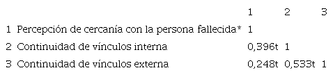 Se evidenció una correlación positiva significativa (rs=0,404; p=0,001), expresando que, a mayor percepción de cercanía con la persona fallecida, mayor es la CV. Otras correlaciones identificadas entre las variables se pueden observar en la Tabla 4.