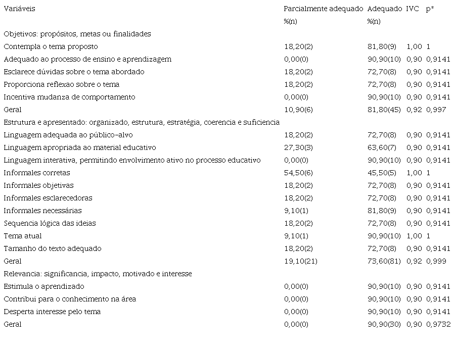 Os especialistas de conteúdo eram enfermeiros, a maioria doutores 63,63% (n=7), com experiencia em saúde da mulher 72,63% (n=8), cáncer de mama 63,63% (n=7) e construyo de vídeos 45,45% (n=5). Houve concordancia mínima de 90,90% (n=10) quanto aos objetivos, estrutura e apresentagáo e releváncia, e, 90,90% (n=10) concordaram que o vídeo estimula o aprendizado, contribui para o conhecimento na área e desperta interesse pelo tema; está adequado ao processo de ensino e aprendizagem, incentiva mudanza de comportamento, linguagem interativa, permitindo envolvimento ativo no processo educativo e tema atual (Tabela 1).