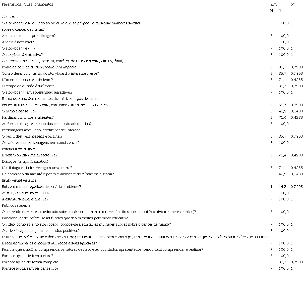 A primeira versáo do storyboard foi submetida a validagáo de conteúdo por profissionais de saúde com expertise em algumas das temáticas seguintes: cáncer de mama, saúde da mulher, surdez ou vídeo educativo. Para a selegáo da amostra, considerou-se o número de seis a 20 especialistas13.