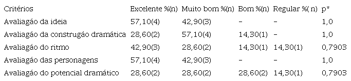 Os itens mais aceitos pelos especialistas, considerados excelentes, foram a avaliagao de ideia 57,10% (n=4) e avaliagao das personagens 57,10% (n=4). Os itens de maior desacordo, considerados regular por um especialista, foram a avaliagao de ritmo 14,30% (n=1) e a avaliagao do potencial dramático 14,30%(n=1).
