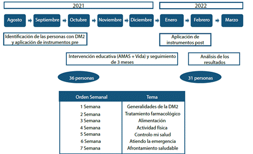 Se aplicó la intervención educativa interdisciplinaria AMAS + Vida fundamentada en el currículo sugerido por la Asociación Americana de Diabetes17 y adaptada por Moreno-Fergusson y colaboradores10, que incluye los siguientes temas: generalidades de la diabetes, alimentación saludable, actividad física, tratamiento farmacológico, afrontamiento saludable, cuidados para controlar la salud y manejo de las emergencias.