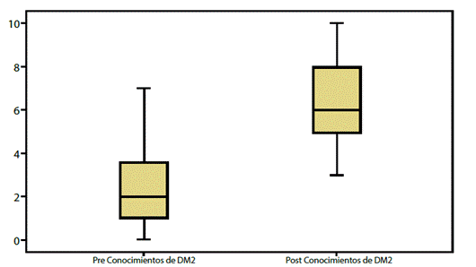 Los resultados de la comparación de las medidas de tendencia central mostraron una diferencia estadísticamente significativa (p < 0.001) entre el conocimiento que tenían los sujetos sobre la DM2 antes de la intervención Amas + Vida, y el que mostraron 3 meses después.