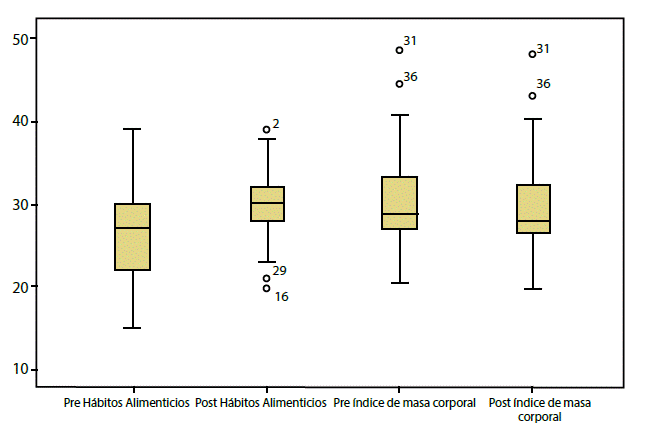 Los resultados muestran que el 90,30% de los participantes tenían sobrepeso al iniciar la intervención con reducción del porcentaje al 87,10% después de esta. El seguimiento a los tres meses muestra una diferencia estadísticamente significativa (p = 0,01), entre el IMC pre y post intervención. La media del IMC en la línea de base fue de 30,59 y desviación estándar de 5,98; mientras que la medición post intervención mostró una media de 29,90 con desviación estándar de 5,70 (ver Figura 3).