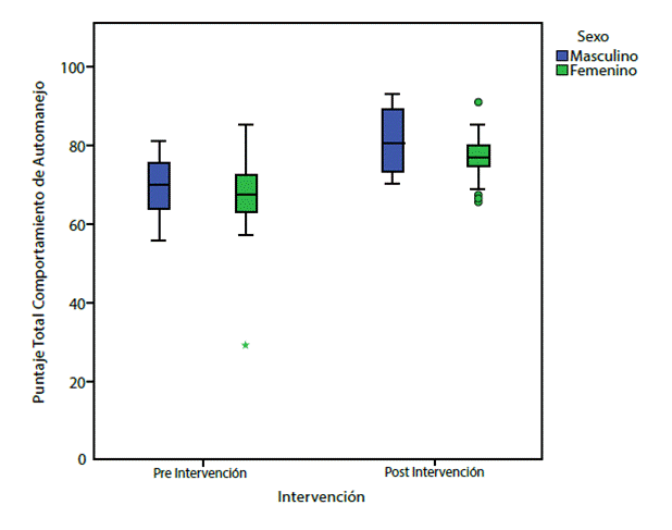 de 10,04; mientras que en la medición post se encontró una media de 77,93, con desviación estándar de 7,05. Pero al comparar la variable sexo con los comportamientos de automanejo no hay diferencia estadísticamente significativa (p = 1,000) (ver Figura 4).