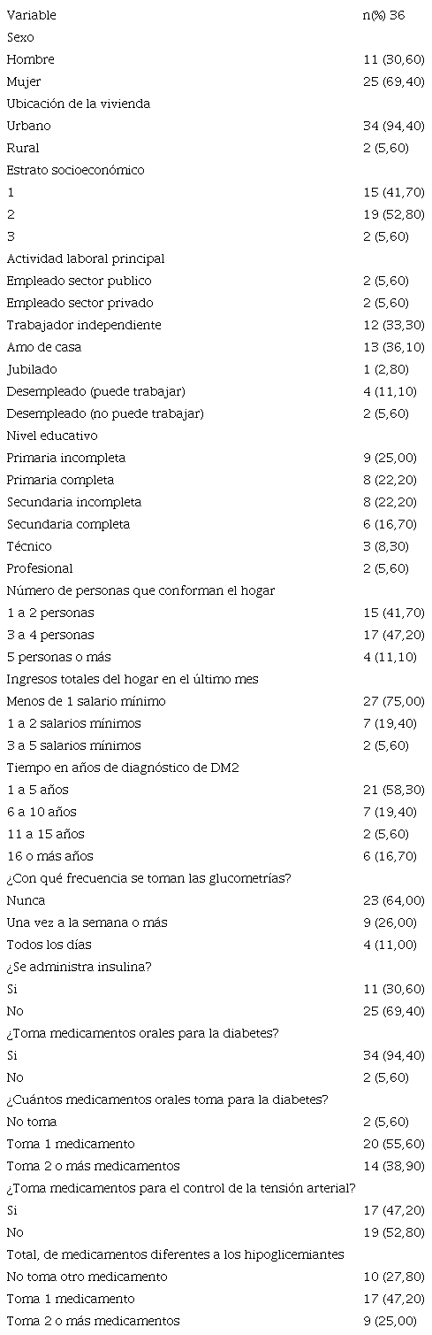 La muestra intencional estuvo constituida por 36 adultos con DM2 entre los 18 y 70 años en condición de vulnerabilidad social (bajo nivel educativo y socioeconómico) atendidos en el servicio de consulta externa de una institución de primer nivel en Neiva - Colombia, durante el segundo semestre del 2021. El tamaño de la muestra cumple con un rango de seguridad para análisis de tamaño de muestra, con una potencia del 90% y un alfa unilateral del 5%, sugerido por Lewis y colaboradores12, y se excluyeron las personas con limitaciones cognitivas o físicas, en estado de embarazo o con tratamiento de cáncer.