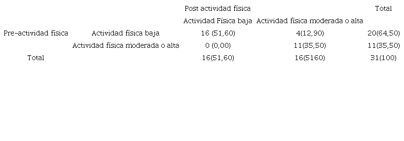 Los resultados de este estudio muestran que 4 personas mejoraron el nivel de actividad física después de la intervención. Sin embargo, la prueba relacionada de Mc Nemar muestra que no hay diferencia estadísticamente significativa entre la actividad física de los sujetos del estudio al comparar los resultados del pre test y post test (p = 0,125) (ver Tabla 2).