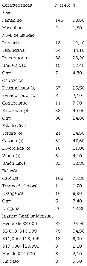 La edad promedio de los participantes fue 35,65 años (DE = 6,44 Min 21 Max 57). En la Tabla 1 se observa que en su mayoría los participantes fueron madres, con un nivel de estudio de secundaria, la ocupación predominante fue empleadas, se encuentran casadas y en su mayoría profesan la religión católica.