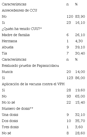 Las madres y padres refirieron que ninguna de sus hijas había recibido la vacuna contra el VPH, el 73,10% (106) de sus hijas contaban con la aplicación del esquema completo de otras vacunas correspondientes a su edad, 16,60% (24) contaba con solo algunas vacunas y 10,40%(15), no estaba segura de que tuviera completo el esquema. En la Tabla 2 se observa que 16,10% de las participantes del sexo femenino contaban con antecedentes de cáncer cervicouterino, 86% mencionaron haberse realizado el Papanicolaou. Respecto a si se habían aplicado la vacuna contra el VPH 19,60% recordaban haberse aplicado la vacuna del VPH, en su mayoría habían recibido alguna dosis de la vacuna contra el VPH.