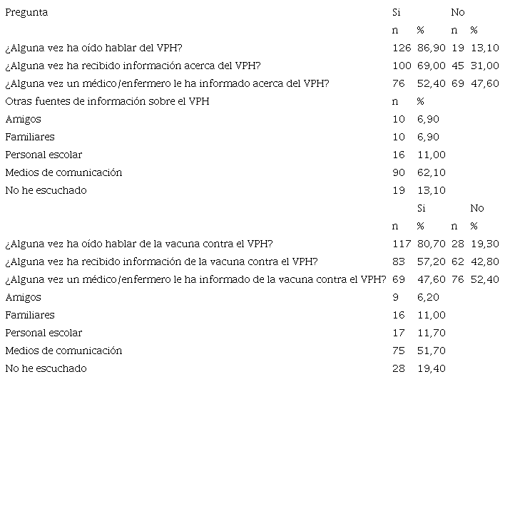 Se encontró que más de la mitad de los participantes alguna vez han recibido información del VPH y de la vacuna contra el VPH, los medios de comunicación fue la principal fuente de información, 47,60% mencionaron que un médico o profesional de enfermería le ha informado de la vacuna contra el VPH (Tabla 3).