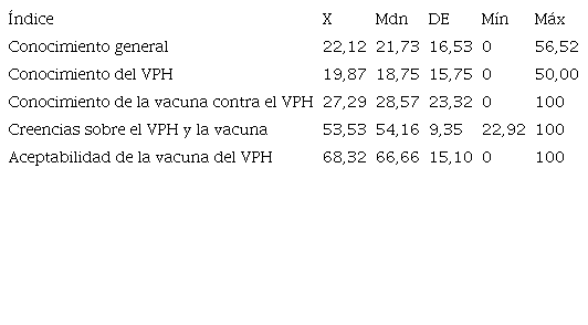 Respecto a las variables de estudio, en la Tabla 4 se observa que el conocimiento general presentó un promedio de 22,12 (DE= 16, 53), el conocimiento sobre la vacuna contra el VPH fue mayor que el conocimiento sobre el VPH (X= 27, 29 Vs IX = 19,87). Las creencias sobre el VPH y la vacuna mostraron un promedio de 53,53 (DE = 9,35). Por otra parte, la puntuación de la aceptabilidad de los padres de familia de la vacuna contra el VPH se situó ligeramente por arriba de la media (X= 68,32, DE = 15,10).