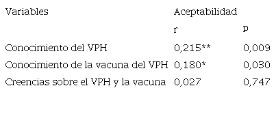 Resultados: El conocimiento sobre el virus del papiloma humano se relacionó con la aceptabilidad de la vacuna (p < 0,009), de igual manera con el conocimiento acerca de la vacuna del virus del papiloma humano (p < 0,030) mientras que las creencias sobre el VPH y la vacuna no se relacionaron (p < 0,747).