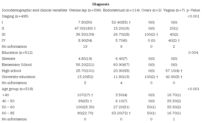 The results obtained indicate an association between gynecological cancers and education, age and staging. More than half of the sample has been in school for a few years and is close to 50 years old. Adding these findings to those of another study12, which records the highest percentage of deaths in the 50-54 age group, it is clear that health actions must adopt specific measures for this age group.