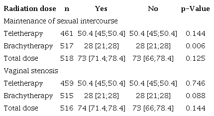 BATD dose/ Gy distributions showed a difference between the categories of maintenance of sexual intercourse (p =0.006) (Table 2). The dose/ Gy distributions in women without sexual intercourse were statistically lower when compared to women who maintained sexual intercourse. Comparisons between the distributions between having or not stenosis were not significant. The average total radiation dose varied between 67.9 and 74 Gy (Table 2).