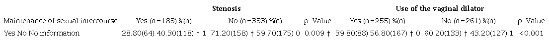 Table 3 presents a comparison between stenosis and the use of a vaginal dilator and the categorical variables studied. The comparison between the proportions of maintaining sexual intercourse and using a vaginal dilator was significant (p <0.001). This result shows that sexually active women use the dilator less, when compared to those who are not sexually active, contradicting professional recommendations for use for an indefinite period, regardless of whether or not sexual intercourse is maintained.