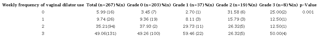 The description of proportions of the crossover between frequency of use of the vaginal dilator and the degree of stenosis was found in the records of 267 women (Table 4).