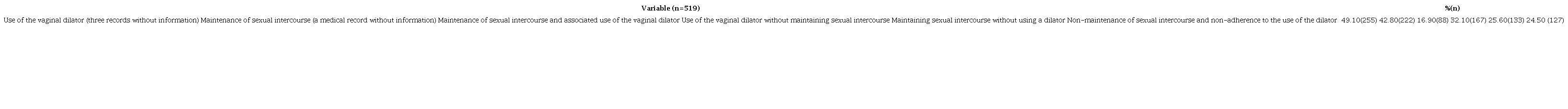 Results: 519 patients records were included in the investigation; the analyzes showed significant associations between the topography and staging (p<0.001), education (p=0.004) and age (p<0.001); the comparison between the distribution of the ionizing radiation dose showed a difference with the continued sexual relationship category (p=0.006); the comparison between the proportions ofcontinued sexual relationship and using a vaginal dilator was significant (p<0.001); 49.10% (131) adhered to the use of vaginal dilator; 24.50% (127) are not sexually active and do not adhere to the use ofthe dilator.