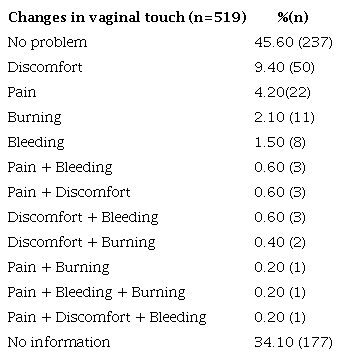 Table 6 describes the changes in vaginal touch reported by women; 45.60% women (337) did not report complaints, 34.10% (117) had no records in the medical records, 9.40% (50) reported discomfort.
