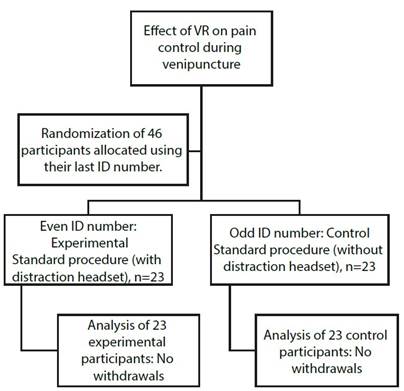 An unblinded, randomized clinical study was conducted between 2022 and 2023 in the pediatric emergency room of a private healthcare facility in Bogotá (Colombia). The population consisted of children and adolescents between the ages of 7 and 14 with a medical indication for venous access. Children and adolescents with an altered state of consciousness, impaired vision or use of glasses, history of failed venipuncture without the use of goggles for visual distraction during the current hospitalization, lack of consent of legal representatives or refusal to participate in the study, and clinically unstable were excluded from the study. The sample size was calculated with a type I error of 5% and 80% power, yielding a sample of 46 participants, 23 experimental and 23 controls. Assignment to the intervention or control group was randomized according to the last number of the patient's ID (if even, the patient was assigned to the experimental group; if odd, the patient was assigned to the control group).