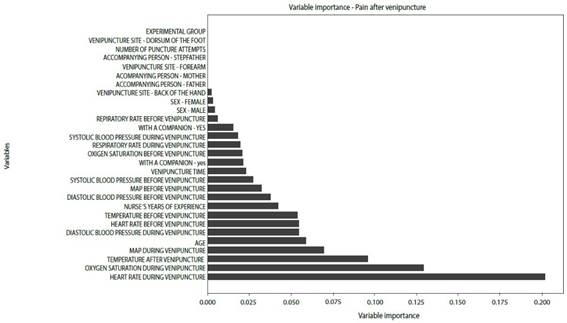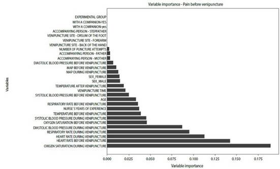 A model was created to identify the most important variables influencing pain before and after venipuncture in the experimental group. Variables such as heart rate, respiratory rate, oxygen saturation, and blood pressure before and during the procedure were important markers of pain during venipuncture in children and adolescents. Variables such as the nurse's years of experience, the participant's age, and the father's presence were important before the procedure. Other variables, such as the duration of the venipuncture and the mother's presence, were important after the procedure (Figures 2 and 3).