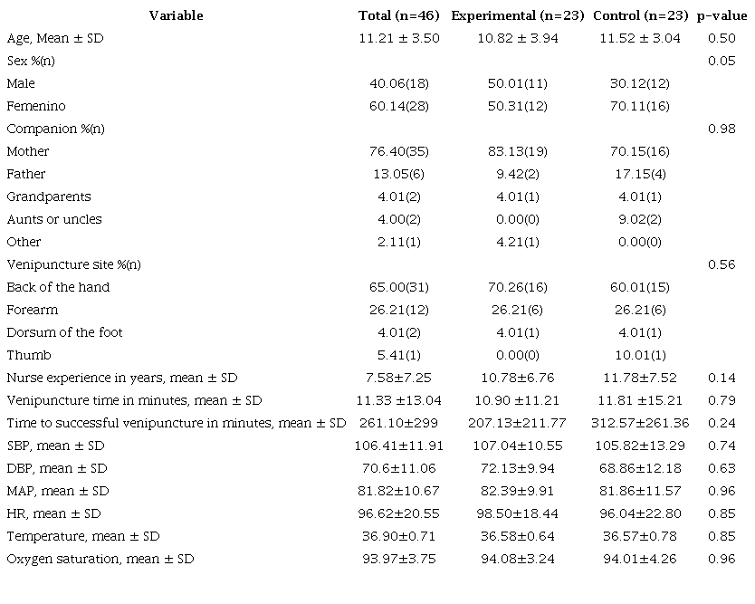 Materials and methods: An unblinded, randomized, experimental study was conducted in the emergency room of a fourth-level care facility. The sample consisted of 46 children and adolescents between the ages of 7 and 14. Twenty- three were randomly assigned to the experimental group with a VR headset and 23 to the control group. The dependent variable ‘pain’ was measured before, during, and after venipuncture using the visual analog scale (VAS) of pain.