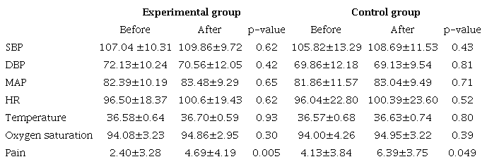 No statistically significant differences were found between the intervention and control groups in terms of vital signs (heart rate, blood pressure, respiratory rate, and oxygen saturation) before and after the intervention (Table 2).