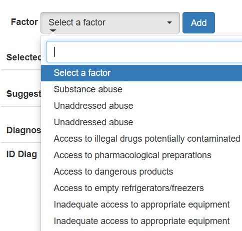 Next, using either the “Factor” or “Characteristic” list displayed on the interface, participants enter the corresponding data by clicking the "Add" button. They are able to type a key term or phrase to access a drop-down list containing a set of technical terms that correspond to the related or risk factors (Figures 2) used by NANDA-I, recording the selected data in the space.