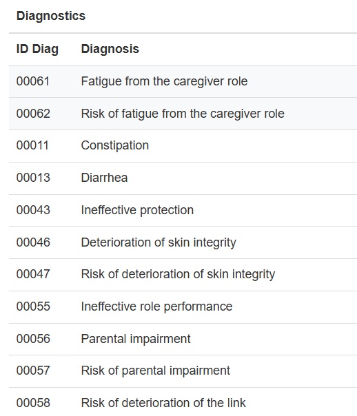 The user who performs a critical analysis has the possibility of choosing the diagnostic labels with their respective codes contextualized to the case under study, allowing them to identify from the label headings the diagnoses focused on the problem (which specifies the human response), those of risk (which precedes the phrase Risk for...), those of health promotion (which precedes the phrase willingness to improve...) or those of syndrome (which precedes the phrase syndrome of...).