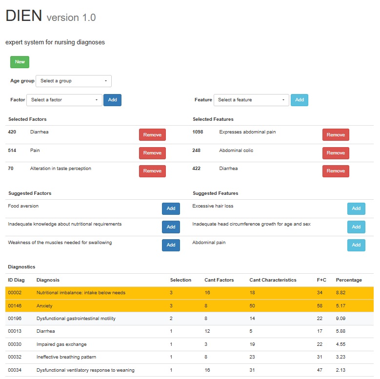 Discussion: The DIEN Expert System Version 1 develops skills to identify characteristics and related or risk factors. It familiarizes users with the standardized nursing language and strengthens critical thinking to formulate contextualized diagnoses for the person cared for.