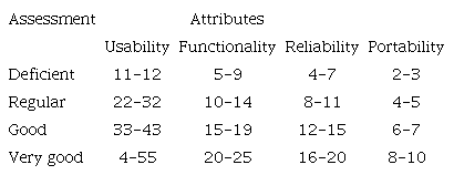 Each item of the attribute is rated by the participant on a scale from 1 to 5, where 1 indicates “poor” and 5 “very good.” The assessment scores for each attribute are calculated by multiplying the number of items by the corresponding score (1 to 5), obtaining the limit of each category (very good, good, average and poor) according to the total score, as shown in Table 1.