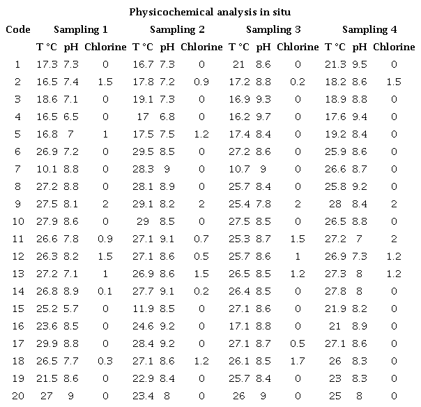 Discussão: Estes achados refletem o não cumprimento das normas vigentes devido à presença de bactérias indicadoras como os mesófilos, e o indicador por excelência da qualidade da água: os coliformes; fato que é confirmado por Pseudomonas spp. e Salmonella spp.