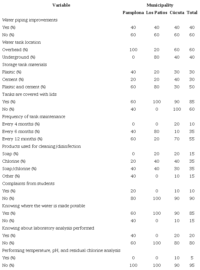 The information collected from school personnel and field observations made it possible to learn about water storage and treatment conditions within the educational institutions. From the data obtained, it was inferred that most schools are over 20 years old (95.00%). Only 40.00% of them reported information regarding improvements of water pipes, a common situation across the three municipalities. In 60.00% of the institutions, water tanks are installed above ground, mainly in the municipality of Pamplona, where all schools have this type of infrastructure. In contrast, underground tanks are more common in Los Patios (80.00%), while in the institutions located in Cúcuta, the proportion of overhead and underground tanks is similar. The predominant tank material is a combination of plastic and cement. This type of tank was observed more frequently in schools of Los Patios and Pamplona (80.00% and 60.00%, respectively). An important fact is that most of the water storage tanks in the institutions are covered with lids. Shortcomings were also identified in the frequency of maintenance, as most institutions reported performing it only once a year (55.00%), which poses a risk that is more frequent among schools located in Cúcuta. Regarding the cleaning and disinfection of the tanks, the most frequently used combination is chlorine and soap (35.00%). Most of the school personnel surveyed were able to recognize and identify the areas where water purification takes place. Only 20.00% of the schools reported conducting microbiological analysis of the water, and only 5.00% reported performing physical-chemical analyses (Table 2).