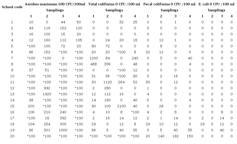 In the cases where E. coli growth was observed, the samples always came from schools in the municipality of Cúcuta. The highest recorded value was 40 CFU/100 ml (Table 3).