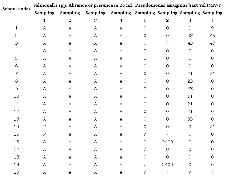 Salmonella spp. is a microorganism strongly associated with the contamination of food or water sources. It was detected in only 10% of the schools studied, and only on a single occasion. Institution #20 showed the presence of Pseudomonas spp. in all samples analyzed (Table 4).