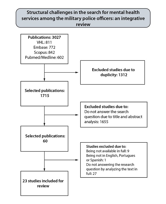 The survey and analysis of articles were conducted in April 2023. For the selection of studies, databases in health via Comunidade Acadêmica Federada (CAFe in Portuguese) access from the Capes Portal Journals: Virtual Health Library (VHL), Medical Literature Analysis and Retrieval System Online Complete (MEDLINE via PubMed), Scopus and Embase were used. The inclusion criteria for selection of articles were based on the language of publication that must include Portuguese, English or Spanish, availability in full text, and approach of the chosen theme (the police officer’s search for mental health services). The exclusion criteria included duplicate articles across databases, review studies, editorials, abstracts, editor’s notes, theses, dissertations, and books.