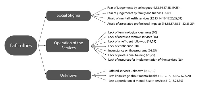 The analyzed articles showed three main variables directly or indirectly related to the difficulties police officers face to access mental health services, which include social stigma, limited availability of existing services and lack of knowledge, as well as misinformation, often negatively associated with the use of these services.