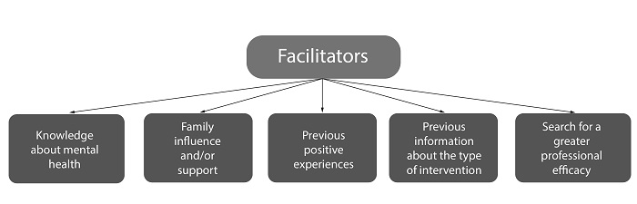 The articles also exposed some variables that facilitate the search for mental health services by military police officers, revealing that having knowledge about mental health favors the search (N=1), influence and support of family members (N=2), previous positive experiences (N=1), have prior information about the type of intervention adopted (N=1), and the search for greater professional effectiveness (N=3) (Figure 3).