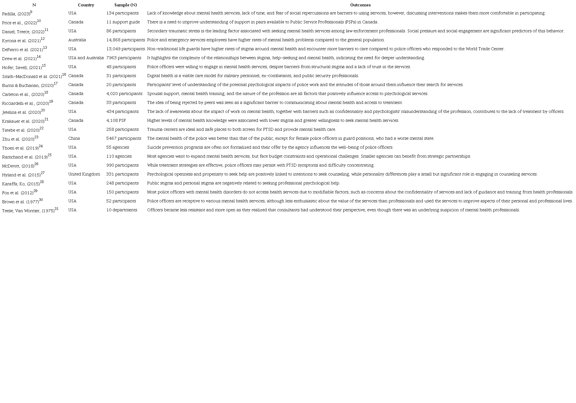 The samples analyzed in the studies varied in size and included active and administrative police officers, public safety professionals in general (including police, firefighters, paramedics and first responders, rescue personnel and operational intelligence staff), health professionals working with the mental health of police officers, as well as police agencies and departments (Table 1).